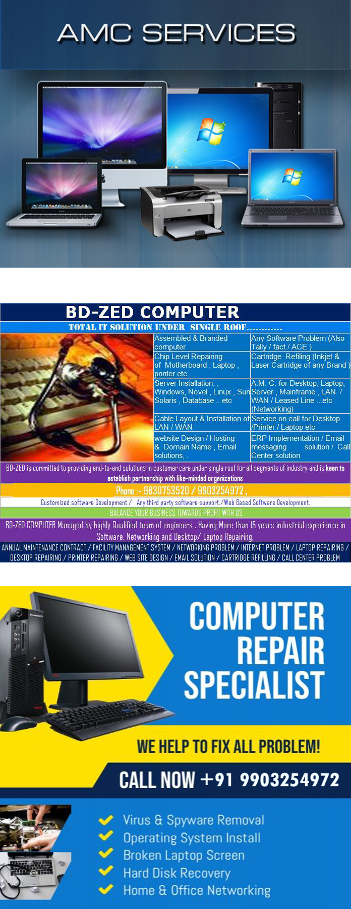 One realizes the value of an AMC (Annual Maintenance Contract) only when one faces a computer emergency. Find instant and cheap solutions to computer emergencies like hard drive crashes, viruses, monitor on the blink, power fluctuations, and lots more right here! Pay for an annual AMC on your computer and get peace of mind. Get cheap AMC estimates on your computers, PCs, laptops, netbooks and lots more. Find the best local AMC contracts and computer experts right here at BD-ZED COMPUTER. 1. Unlimited door step visits. 2. 4 to 24 Hours support Guarantee. 3. 100% Resolution guaranteed. 4. Support for all brands. Dell, HP, HCL, ACER, SAMSUNG, LG, 5. Microsoft, Apple etc. 6. FREE Remote Support . 7. 365 Support, 7 Days working. 8. Quarterly System Performance Checking. 9. On-site support. 10.Virus and malware removal / Firewall Support. 11.Internet Support / Security Support. 12.Computer repair and diagnostics. 13.Email & Email Client setup. 14.Windows troubleshooting. 15.Speed up a slow computer. 16.Add / Remove Computer Hardware. 17.Printer Maintenance. 18.Monitor maintenance. 19.Network Troubleshooting. 20.Virus Protection and Virus Removal. 21.Single Window Support to all your PC Repair Needs. We have a technically sound team to take care of our AMC service. We give door-to-door service and are fully equipped to meet the power service requirements of our customers with varied needs. We adapt ourselves with updated technology to meet the ongoing demands in the market. Our contracts help save maintenance costs and reduce the breakdown time. Depending upon the product and client requirements we offer AMC for 1 year. It will be renewed every year. Advantages: . Saves from unexpected failures and repairs . We offer 365 days and 24/7 support. . Highly reliable and planned services for your products . We offer AMCs for our products, competitor products to support our clients. The detailed terms & conditions are as follows: The terms of the service, as per this contract will be in accordance with offer as above. This shall be a Service Level Agreement. The Contract does not cover the equipment / parts which may have been damaged due to misuse, negligence, accident, wear tear, pests, fire, water and other natural calamities etc. Should any unauthorized person be permitted to access the database or installed applications, software/hardware under agreement and in the event of failures, support shall be on chargeable basis. The above-mentioned contract does not include the data entries, software customizations, data corruption, data recovery or lost data due to virus attacks if any. However, we ensure that all necessary steps will be taken to ensure proper functioning of the system. Should any unauthorized person be permitted to undertake repairs of the equipment under agreement in the event of failures, replacement or repairs shall be on chargeable basis. In case of failure of parts or equipment it shall be tried that defective parts are repaired at site, however in case of inability to do the same shall be required to be brought back to our works for repairs. The defective part shall be repaired and not replaced. The Company shall not be liable for any delay in rectifying the system due to non-availability of spares. This Annual Maintenance Contract does not include shifting and reinstallation of equipment. This AMC does not include shifting and reinstallation of the application on other machines. However, reinstallation of the application software/hardware, if supplied by us will be governed by our offer as above. In event of failure due to the PC machine that has not been supplied & supported by us, we shall not be held liable for repair or delays in support. Documents Required: 1. Purchase order 2. Letterhead of the Company 3. Address proof only (For Home Users) Note: Payment has to be paid in advance every six months. For more info, visit www.digitalmarketinginindia.co.in or call +91 9903254972 /9830753520
