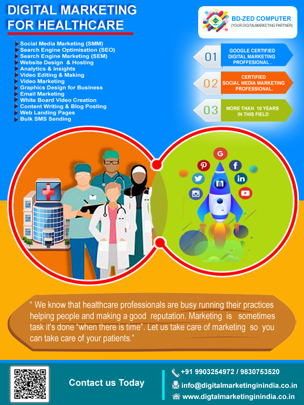 We know that healthcare professionals are busy running their practices helping people and making a good reputation. Marketing is sometimes task it is done when there is time. Let us take care of marketing so you can take care of your patients. Today, it is not important whether you have a digital presence for your healthcare organisation or not . It is important how strong a presence you have. To win online, you need a comprehensive strategy that includes a marketing-driven responsive website, search advertising, display advertising, blogs, search engine optimisation, social media, and more. We are pioneer in Healthcare/Hosptial Digital marketing and our offers as follows: - Regular Updation of all social media channels with graphic design contents related to Hospital . - Regular Posting of different test and Diagnostics on all India Groups & lead generation. - Posting and sharing of weekly blog related to your Healthcare Business , - Website optimisation for search engine marketing & Mobile . - Google first page ranking of Healthcare/Hospital website in relevant keywords. - Website organic traffic generation and monitoring through Google Analytics, etc... .